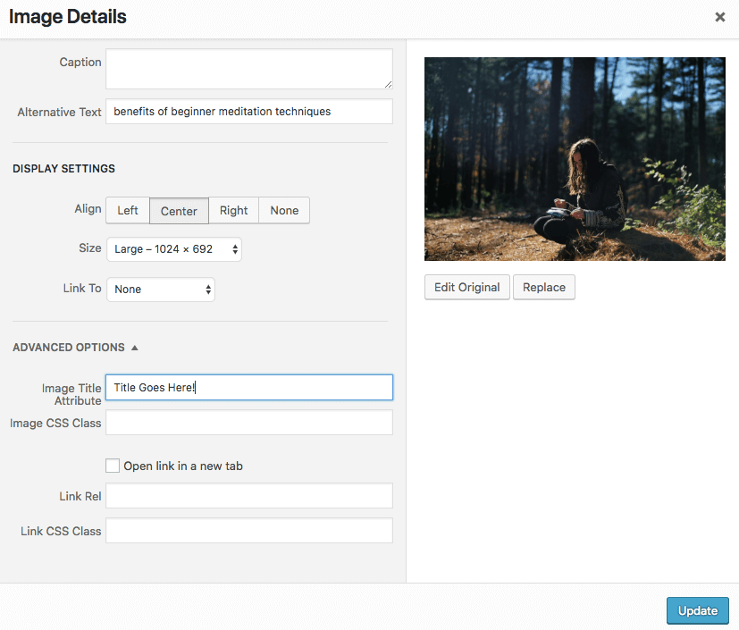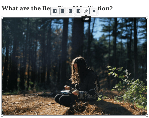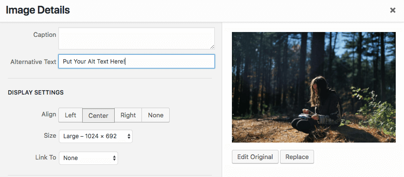 To change your image alt text navigate to your visual editor and hover over an image you’ve inserted. Once again, click on the pencil icon which will bring up the ‘Edit’ option. The pop-up box will bring up your image details. Look for a field called ‘Alternative Text’, and enter your focus keyword or related keyword into that box.