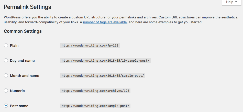 The cleanest and most search engine friendly URL structure is the “post name” setting. By switching to this setting you’ll also be able to include your post or page title, and even a keyword in your URL. To change this setting navigate to Settings › Permalinks.