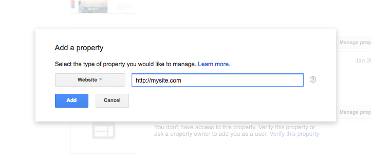 To add your site to Google Search Console first navigate to this page and sign up with your Google account. Next, click on the ‘Add A Property’ button and enter your website’s URL.