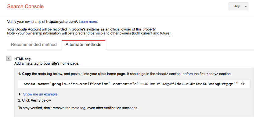Click ‘Add’, and you’ll be taken to a screen where you’ll need to verify the ownership of your site. There are multiple methods you can use to verify your site, but the easiest is selecting Alternate methods, then choosing HTML tag.
